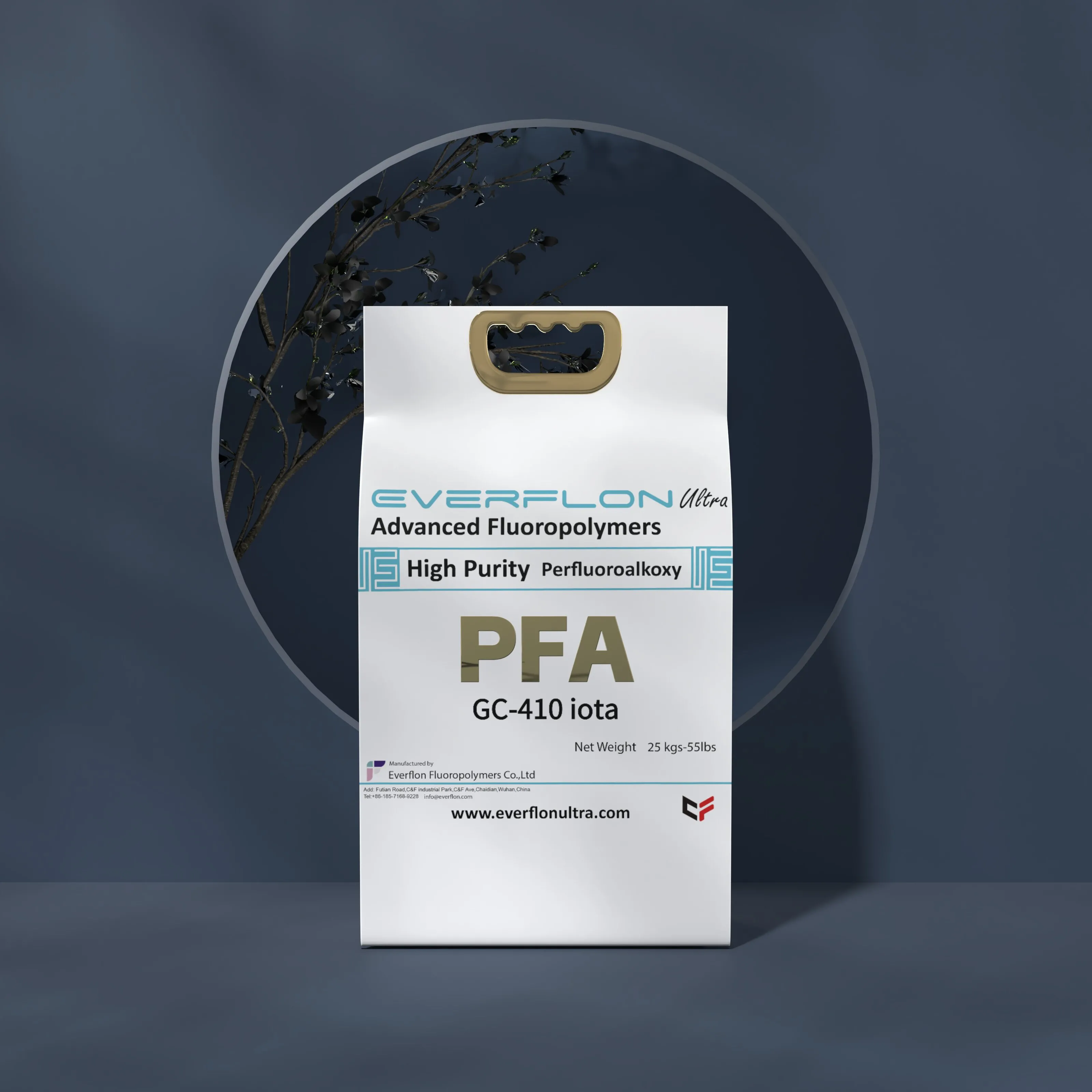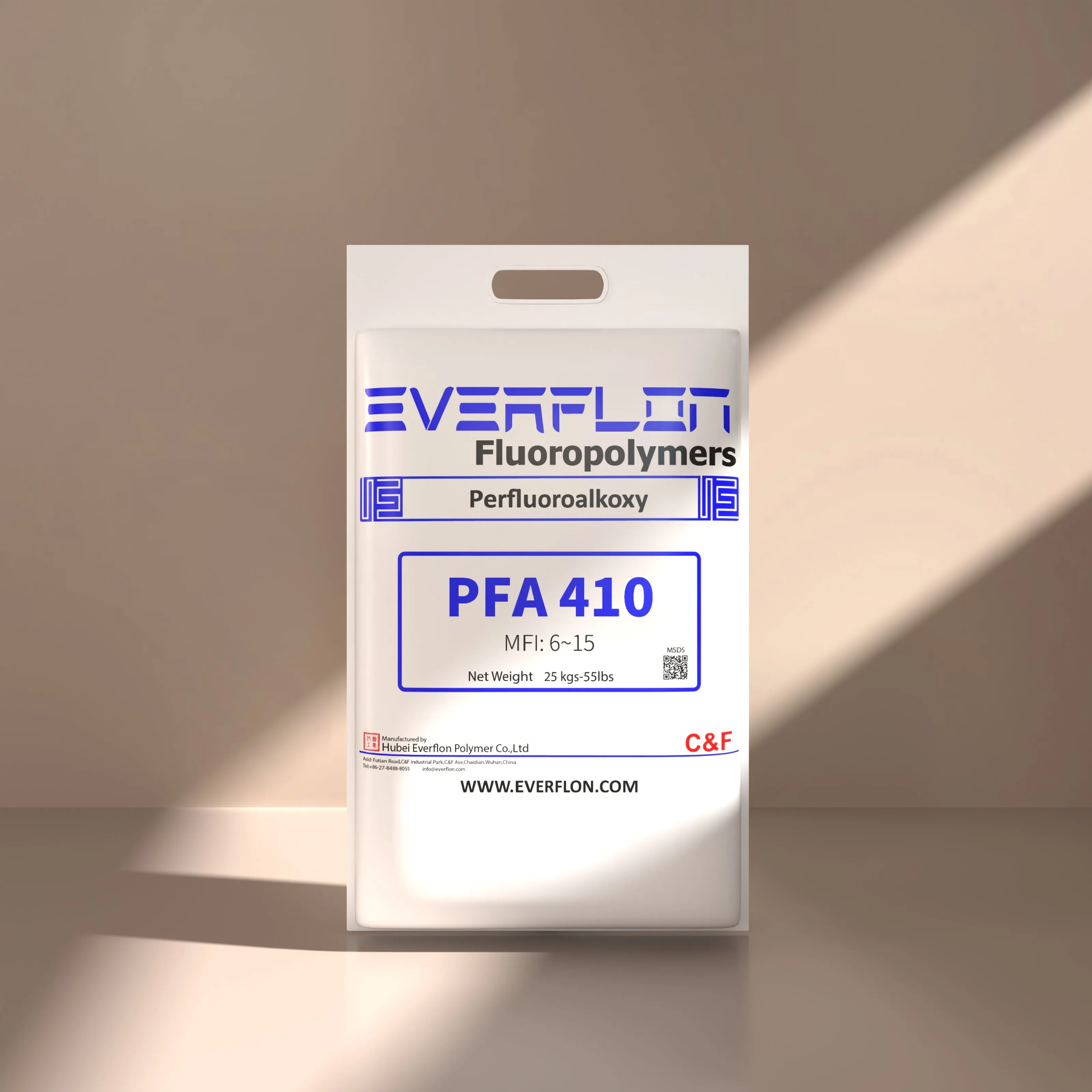 The properties of Everflon™ PFA resin are not affected by storage time. Ambient storage conditions should be designed to avoid airborne contamination and water condensation on the resin when it is removed from containers. Everflon™ PFA is supplied as pellets and is available in 25-kg multilayer bags with an integral polyethylene liner.