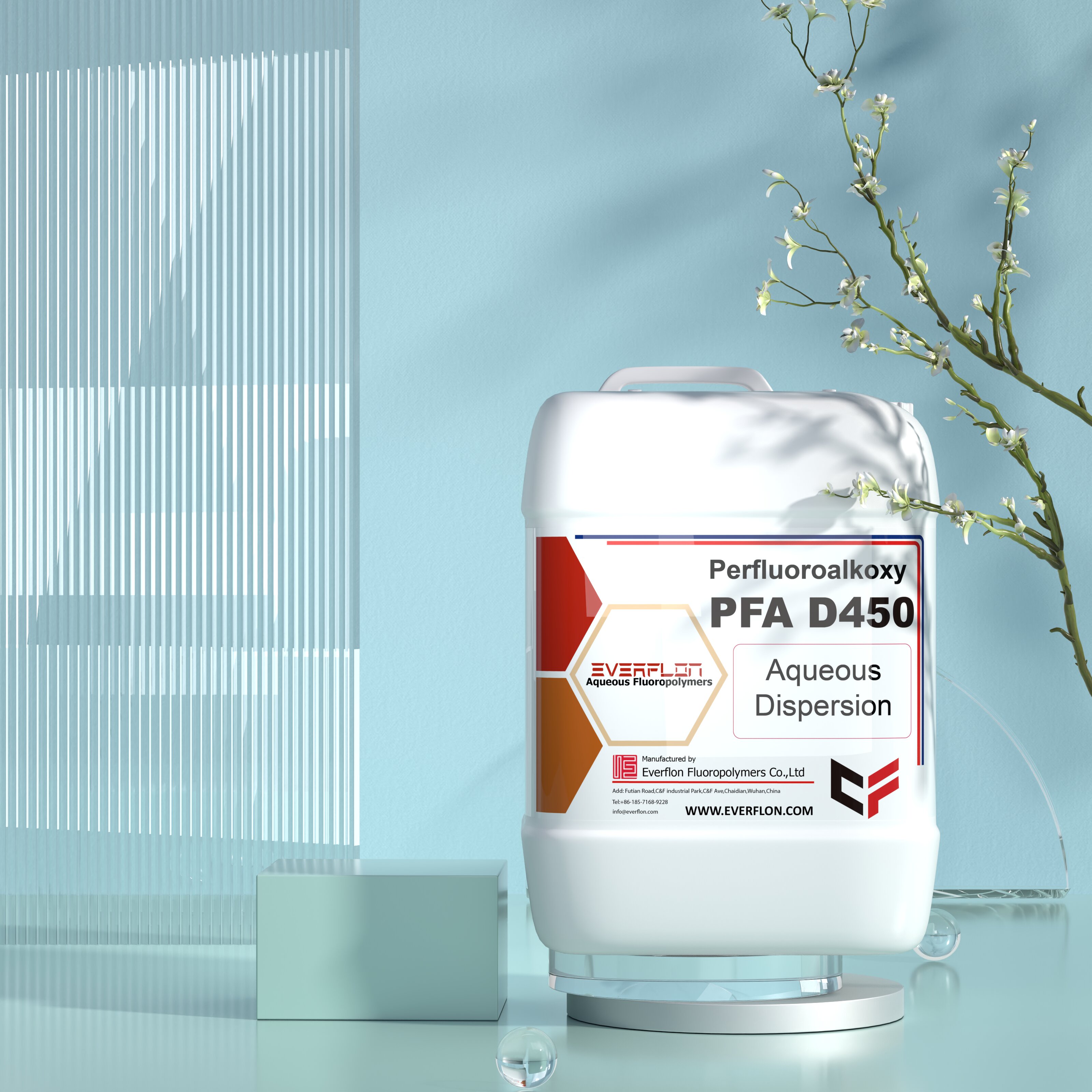 Everflon™ PFA D450 é uma dispersão aquosa de perfluoroalcóxi (PFA) de cor branco-amarelada, estabilizada com um surfactante não iônico. Trata-se de uma dispersão de uso geral que pode ser utilizada para conferir algumas das propriedades exclusivas do PFA a produtos finais que seriam difíceis de fabricar utilizando processos tradicionais de extrusão por fusão. Pode ser utilizada para revestir ou impregnar estruturas porosas ou para produzir filmes finos. Pode ser aplicada por revestimento e colagem por fusão em resina de politetrafluoroetileno (PTFE) ou utilizada como adesivo termofusível. A resina PFA presente no Everflon™ PFA D450 é um termoplástico fluido por fusão, proporcionando propriedades superiores típicas de resinas fluoroplásticas: retenção de propriedades após uso a 260 °C e propriedades úteis a –240 °C .